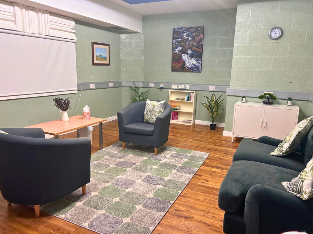 Fel rhan o’r prosiect, trawsnewidiwyd yr hen stiwdio recordio yn EVI yn lle tawel, croesawgar ar gyfer cwnsela, ymwybyddiaeth ofalgar, a gweithgareddau lles – gan greu amgylchedd a gynlluniwyd i gefnogi iechyd meddwl ac emosiynol y cyfranogwyr.