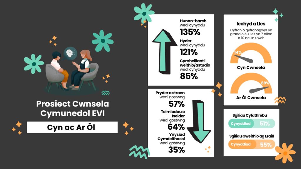 I ymateb i hyn, lansiwyd Prosiect Cwnsela Cymunedol EVI, sydd bellach wedi darparu dros 110 awr o gwnsela am ddim, gan ddarparu hyd at 12 sesiwn am ddim i bob cyfranogwr ac arbed tua £8,160 i’r gymuned mewn costau therapi.