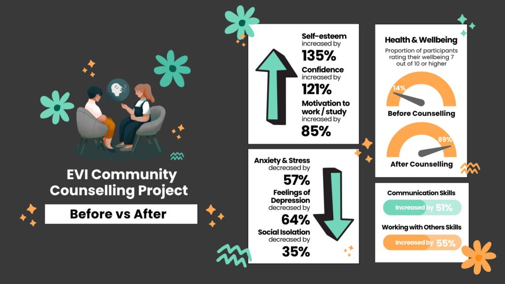 In response, we launched the EVI Community Counselling Project, which has now delivered over 110 hours of free counselling. It provides up to 12 sessions per participant and has saved the community an estimated £8,160 in therapy costs.