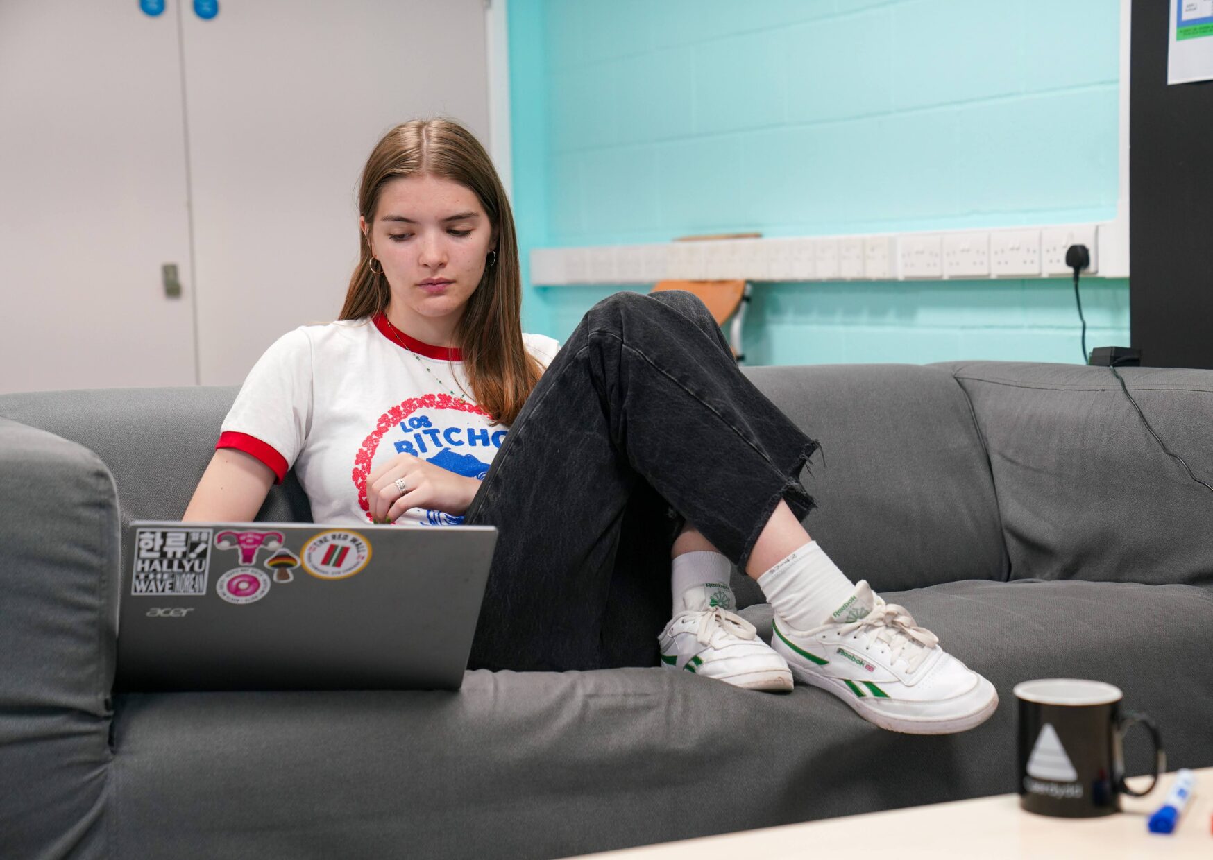 MoFG Peer Service Designer sat on a sofa with their feet up, using a laptop for research